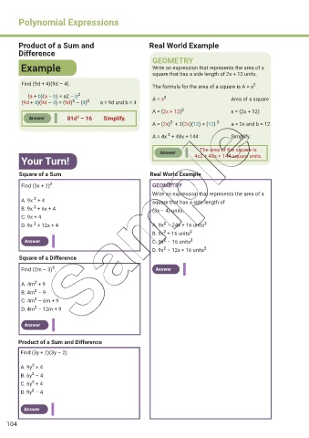 (a + b)(a – b) = a2 – b 2 A = s Area of a square
