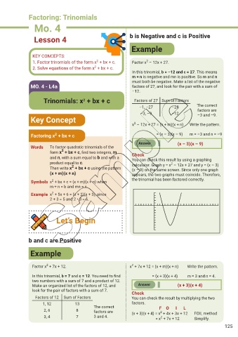 In this trinomial, b = 7 and c = 12. You need to f nd = (x + 3)(x + 4) m = 3 and n = 4.