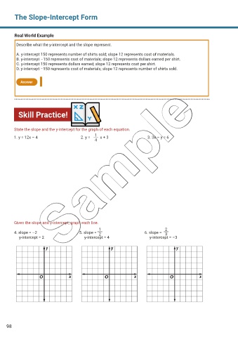 D. y-intercept –150 represents cost of materials; slope 12 represents number of shirts sold.