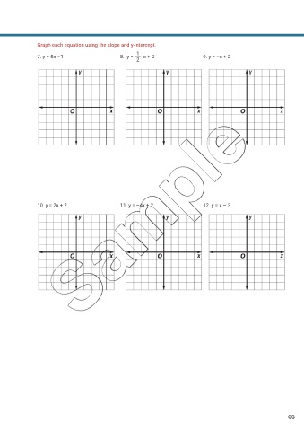 Graph each equation using the slope and y-intercept. 1 7. y = 5x –1 8. y = x + 2 9. y = –x + 2 2 10. y = 2x + 2 11. y = –4x + 2 12. y = x – 3 99