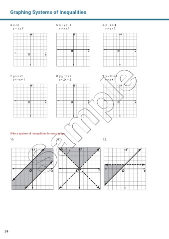 Graphing Systems of Inequalities 4. x < 2 5. x + y < –1 6. y – x > 4 y – x < 2 x + y > 3 x + y > 2 7. y > x +1 8. y > –x + 2 9. y < 2x + 4 y > –x + 1 y < 2x – 2 y > x + 1 Wite a system of inequalities for each graph. 10. 11. 12. 34