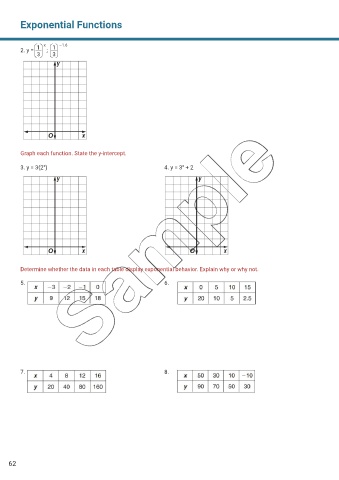 Exponential Functions x 1 2. y = ; 1 –1.6 3 3 Graph each function. State the y-intercept. x x 3. y = 3(2 ) 4. y = 3 + 2 Determine whether the data in each table display exponential behavior. Explain why or why not. 5. 6. 7. 8. 62
