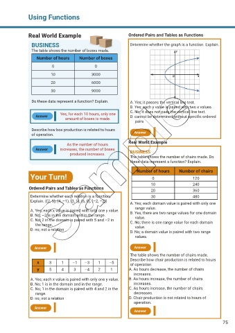 A. Yes; each x value is paired with only one y value. B. As hours increase, the number of chairs