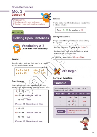 1. Identify and solve open sentences. A value for the variable that makes an equation true