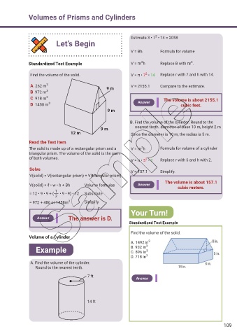 The solid is made up of a rectangular prism and a V = πr h Formula for volume of a cylinder