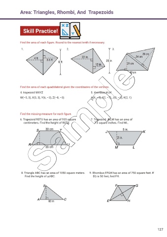 8. Triangle ABC has an area of 1050 square meters. 9. Rhombus EFGH has an area of 750 square feet. If