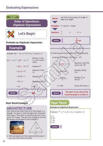 Evaluate 2(x – y) + z if x = 4, y = 3, and z = 2. B. Find the area of one side of the Great Pyramid.