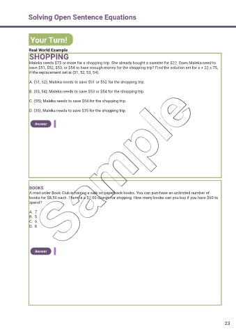 A. {51, 52}; Maleka needs to save $51 or $52 for the shopping trip.