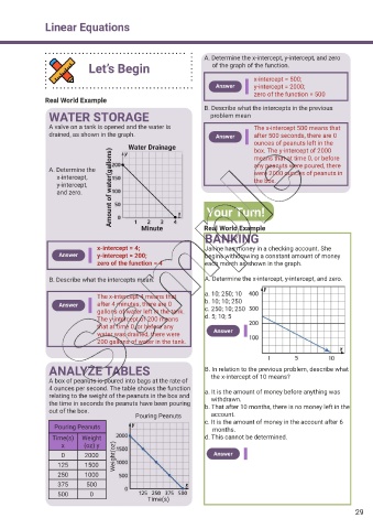 B. Describe what the intercepts mean. A. Determine the x-intercept, y-intercept, and zero.