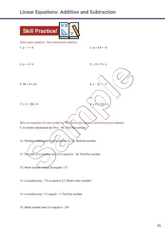 11. The sum of a number and 67 is equal to –34. Find the number.