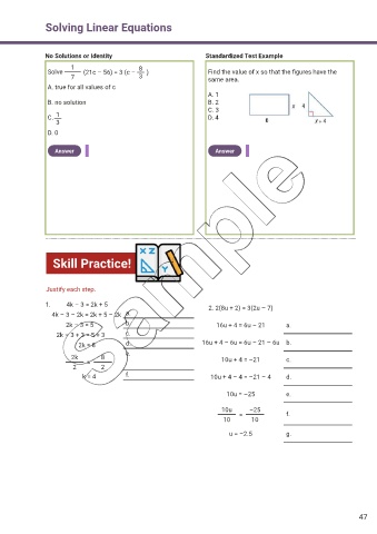 Solve (21c – 56) = 3 (c – ) Find the value of x so that the f gures have the