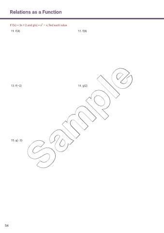 Relations as a Function 2 If f(x) = 3x + 2 and g(x) = x – x, f nd each value 11. f(4) 12. f(8) 13. f(–2) 14. g(2) 15. g(–3) 54