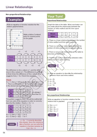 suggests that y = 3x. Check this equation. between hours and miles walked.