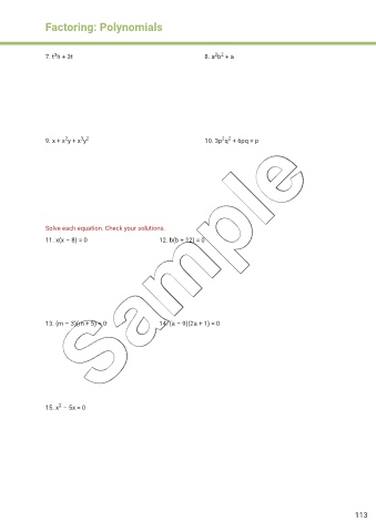 Factoring: Polynomials 2 2 7. t²h + 3t 8. a b + a 2 2 2 3 2 9. x + x y + x y 10. 3p q + 6pq + p Solve each equation. Check your solutions. 11. x(x – 8) = 0 12. b(b + 12) = 0 13. (m – 3)(m + 5) = 0 14. (a – 9)(2a + 1) = 0 2 15. x – 5x = 0 113
