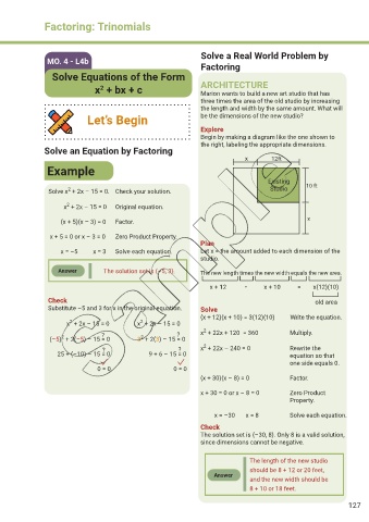 Answer The solution set is {–5, 3}. The new length times the new width equals the new area.