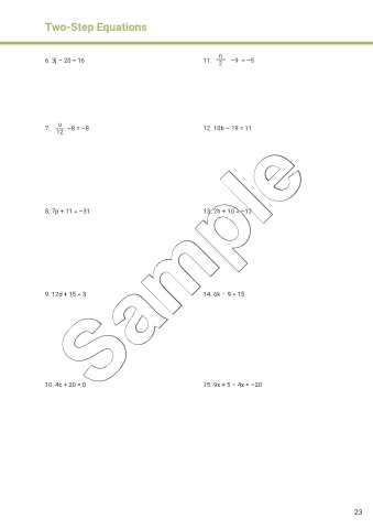 Two-Step Equations n 6. 3j – 20 = 16 11. –9 = –5 2 u 7. –8 = –8 12. 10b – 19 = 11 12 8. 7p + 11 = –31 13. 2h + 10 = –12 9. 12d + 15 = 3 14. 6k – 9 = 15 10. 4c + 20 = 0 15. 9x + 5 – 4x = –20 23