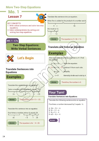 Answer The equation is 2n + 5 = –25. Translate the following sentence into an equation.