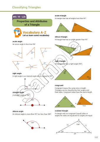 An obtuse angle is more than 90° but less than 180°. A triangle with no congruent (equal) sides or