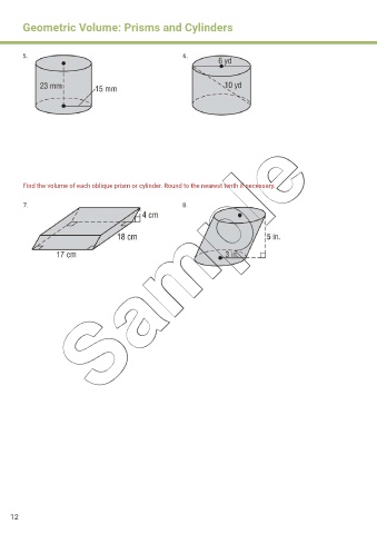 Geometric Volume: Prisms and Cylinders 5. 6. Find the volume of each oblique prism or cylinder. Round to the nearest tenth if necessary. 7. 8. 12