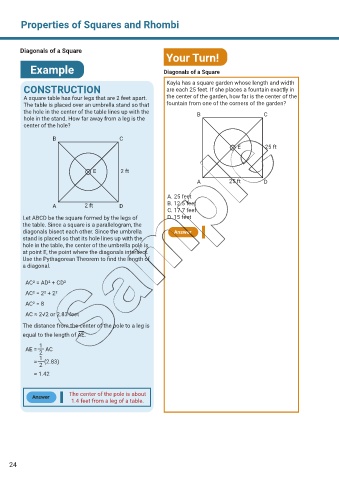 A square table has four legs that are 2 feet apart. the center of the garden, how far is the center of the