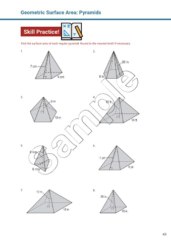 Geometric Surface Area: Pyramids Skill Practice! Find the surface area of each regular pyramid. Round to the nearest tenth if necessary. 1. 2. 3. 4. 5. 6. 7. 8. 43