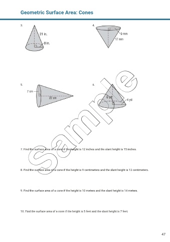7. Find the surface area of a cone if the height is 12 inches and the slant height is 15 inches.