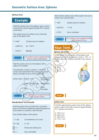 Find the surface area of a ball with a circumfer- given a great circle with an area of approximately