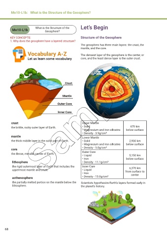 Let us learn some vocabulary core, and the least dense layer is the outer crust.