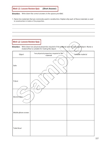 Direction: Write down two physical properties required of the material used to make each object. Name a
