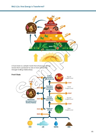 Mo2-L2a: How Energy is Transferred? A food chain is a simple model that shows how energy moves from a producer to one or more consumers through feeding relationships. Food Chain 49